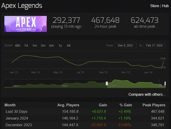 I think the spike in players are because people have heard about the changes, new legend unlock challenges, and new mode and they want to try it out of curiosity and unlock the legends. Once they do if the game isn't fixed I'm willing to bet these figures will drop drastically. Especially if the constant crashing, lagging, movement, and gun issues aren't fixed. The new perks aren't really my issue even though I'm not crazy about them, but the way the game was slowed down and altered.