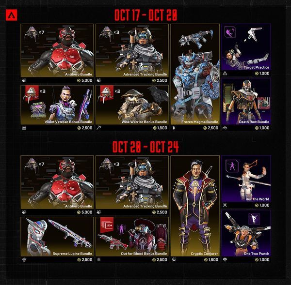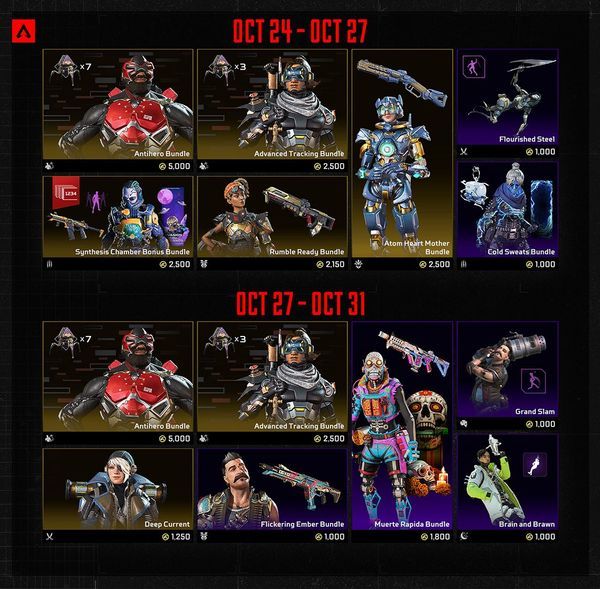 Los 24 objetos estarán disponibles a cambio de monedas Apex o metales de fabricación y en los packs Apex del evento Doppelganger† durante todo el evento.