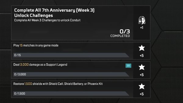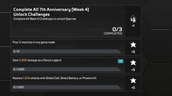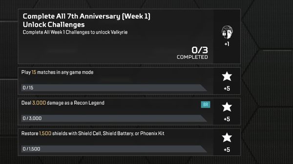 Co tydzień podczas 7. rocznicy pojawia się nowy zestaw wyzwań. Ukończ wszystkie 4 i na stałe odblokuj legendę z tego tygodnia. Każde wyzwanie nagrodzi również 5 gwiazdkami przepustki bojowej.