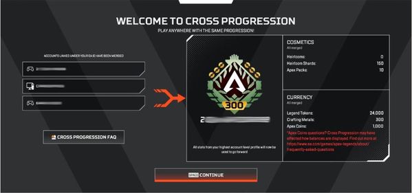 Durante o processo de atualização da progressão entre plataformas, identificaremos o que chamamos sua "plataforma primária". Isso é determinado pelo maior nível alcançado em todas as suas plataformas. Todo o conteúdo e saldos de Moedas Apex serão associados a essa conta única no futuro, mas apenas as estatísticas (ou seja, o progresso) da plataforma primária serão mantidas. As estatísticas/progresso das outras plataformas não estarão mais acessíveis.