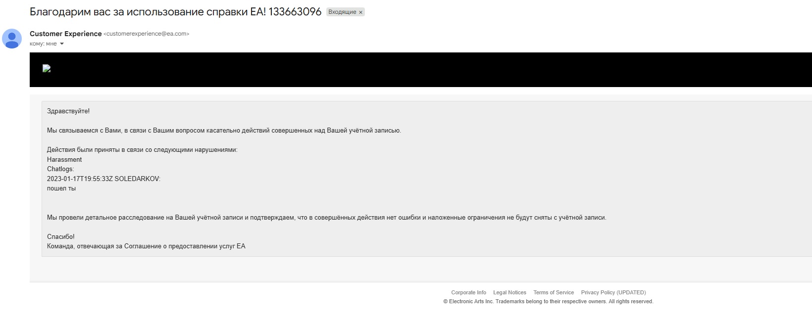 В январе 2023 года мой аккаунт в Apex Legends был заблокирован навсегда за фразу «пошёл ты». При этом многие знакомые и другие игроки получали аналогичные баны даже за куда более безобидные, а порой и вовсе абсурдные высказывания. Сразу после блокировки я пытался оспорить решение, и даже спустя два года снова обращался в поддержку, но безрезультатно. Ответы приходят будто от автоответчика, и диалога по сути не получается, но всё же.