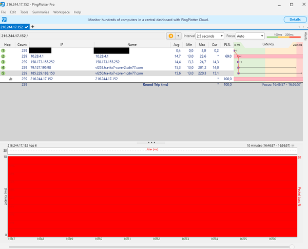 vl250.fra-itx7-core-1.cdn77.com (185.229.188.150) springt die Latenz immer wieder massiv nach oben. - Im Screenshot sieht man in der Spalte „Max“ Spitzenwerte von 201 ms und 220 ms.
