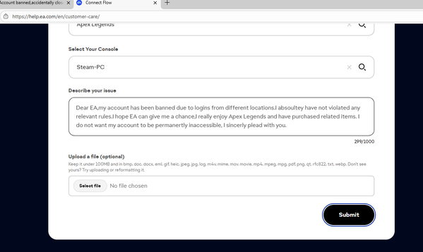 Dear EA,my account has been banned due to logins from different locations.I absoultey have not violated any relevant rules.I hope EA can give me a chance,I really enjoy Apex Legends and have purchased related items. I do not want my account to be permanertly inaccessible, I sincerly plead with you.