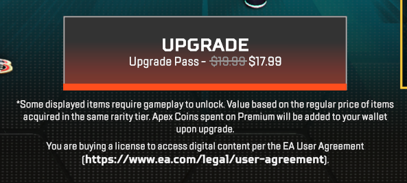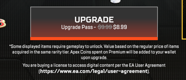 - Upgrading from No Pass/Premium to Ultimate | $10 - (refunds 950 Apex Coins if upgrading from Premium)