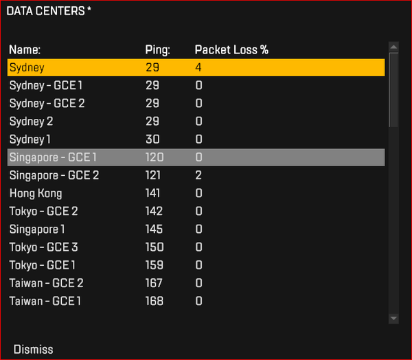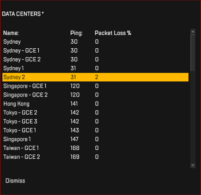I played on the Sydney Data Centre below (top of the list) last night. Yet notice how now Sydney 2 has the packet loss? Seems a bit random?