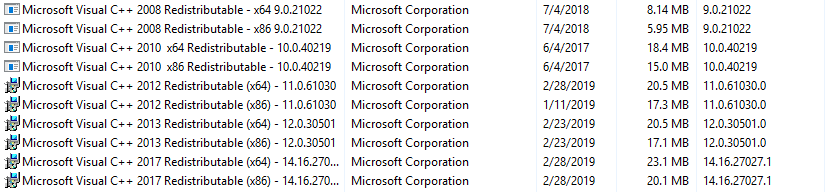 Remove that 1 2008 version 9.0.30729.. Dont have multiple versions installed you only need 1 x64 and 1x86 for every year of visual c++.. Same for that 1 version of 2012 (11.0.60610)..