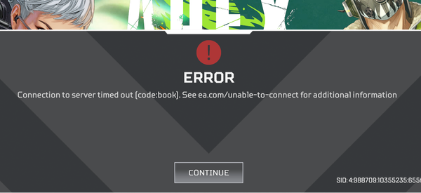 I've had this issue for about a week now. Whenever I try to go past the main menu, I get stuck in a black loading screen with the Apex logo in the bottom-right corner. It hangs for 2–3 minutes, then times out with a code:book. I've tried reinstalling and veryifing the game files, but to no result. Changing the data center also does nothing.