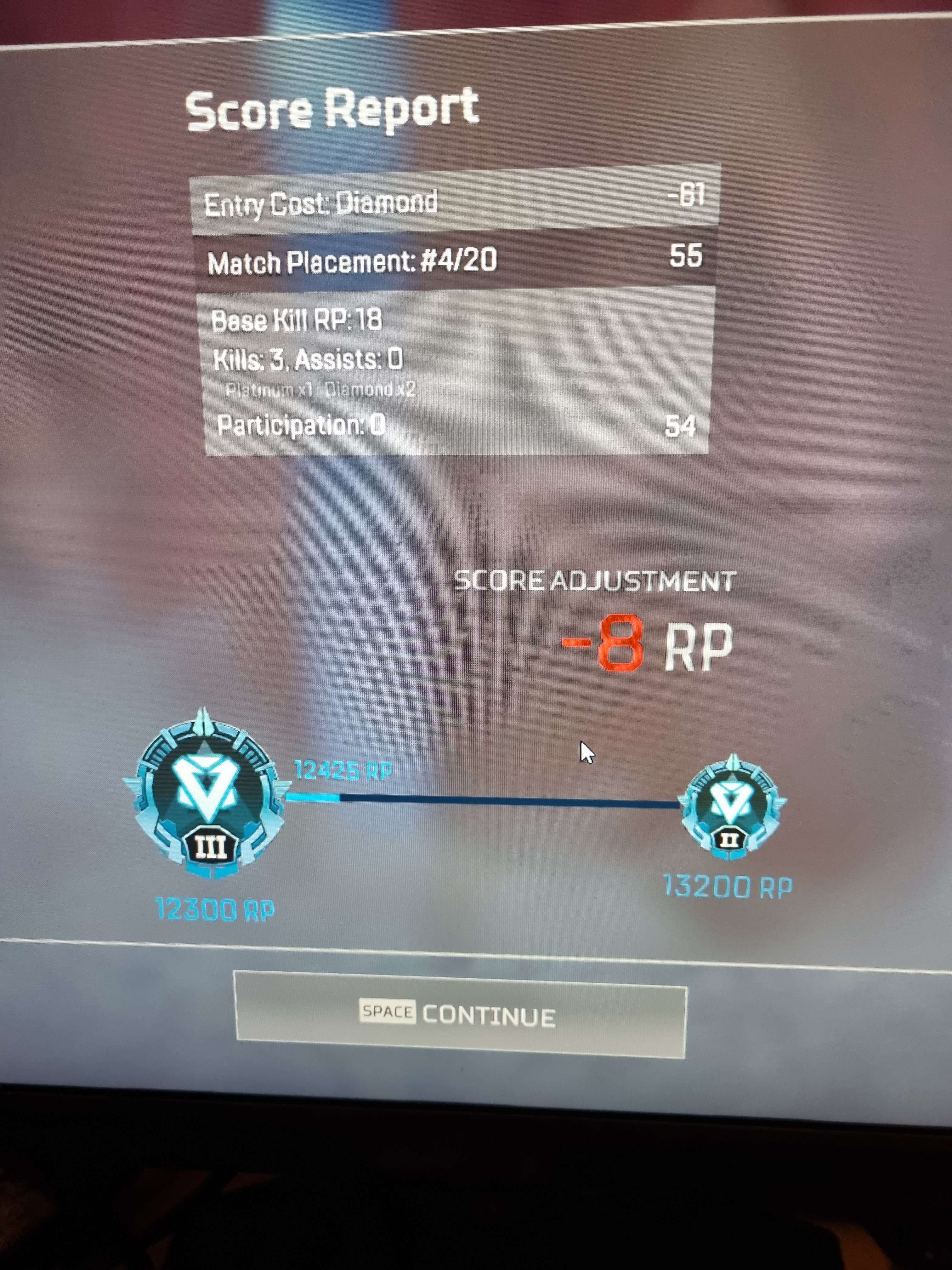 Nothing goes wrong throughout the game, it's not a match that gets DDOS'd (which you get every 1-5 games in Diamond), but the moment we get that summary screen boom RP gets scammed.