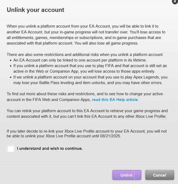 I recently switched the EA account my PSN account was on, do not do that, i tried logging into my Apex Legends stuff just be met with a clean slate. Now Ik **bleep** well someone can help me unlink my account and link it back to its original bc i do NOT have the time nor patience to be waiting 6 months just to play Apex legends with the characters that I BOUGHT, and that I SPEND MONEY ON. I shouldn't be locked away from all of my stuff that is rightfully purchased by me. And dont give me the "oh contact ea help" not only is it impossible to find where the hell that is, they flat out have told me they cant do anything at all, not even the higher ups can do it, which ik is bs bc somebody place that wait there so somebody has to be able to bypass that wait time.