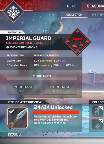 For example, the new Imperial Guard collection event started today and will run through until March 21st. All 24 cosmetics must be unlocked before this date to receive the new Heirloom, simply purchasing the correct packs is not sufficient. If you purchase packs for an event, make sure you open them before the event ends.