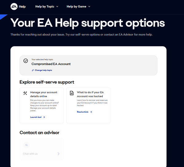 My account was compromised and banned last month, but I managed to recover it and get it unbanned with the help of an EA advisor. However, when I tried logging in to play, it said that I needed to link my EA account to my Steam account. The problem is that I can’t link my EA account to my Steam account because it’s currently linked to a different Steam account (the guy who compromised my account) and now I have to wait 365 days to link it back to mine??? I have tried submitting a ticket to EA Help countless times to no avail it because it doesn't make an actual ticket, I also can't seem to get ahold of an ea advisor because whenever I check, it's grayed out.