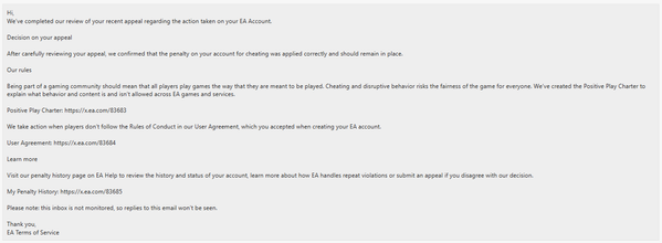 It would be greatly appreciated if EA QUICKLY acknowledged that these new permanent ban waves are erroneous and are simply the result of changes in player behavior… caused by changes in game modes.