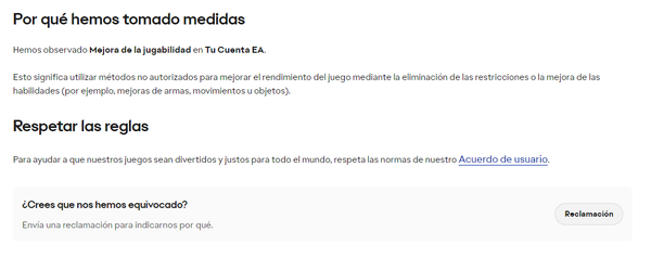 Este artículo puede serte de ayuda: Explicación de bloqueos, vetos y suspensiones de la Cuenta EA