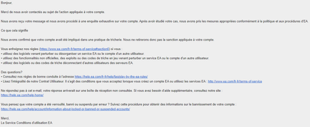 Hello, encore moi désolé. Suite à mon ban datant du 14/02/2025 à 9h03, j'ai enfin reçu une réponse d'EA. La voici : A savoir que je suis ban pour "tricherie". Pour ma défense, je joue depuis...