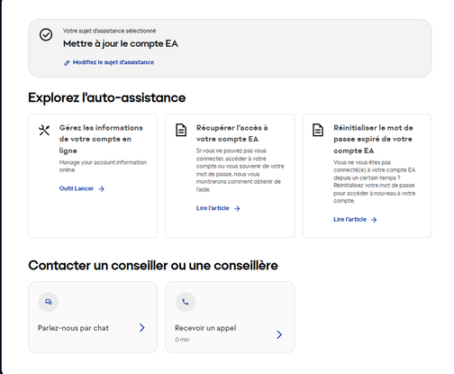 Bonjour, je n'arrive pas a contacter le support EA et avoir une discussion avec eux a propos d'un remboursement. Cela fait 2 jours que j'essaye mais l'endroit ou ce trouve le chat en direct après avoir remplis tout le formulaire de la demande, celui-ci est grisé donc impossible d'avoir un chat ou même d'ouvrir un dossier ce qui est très embêtant. A l'aide donner moi un lien qui fonctionne ou bien une solution qui marchera car je ne suis pas le seul ayant ce problème. Je pense qu'il faudrait résoudre ce problème car on a l'impression que EA n'est absolument pas proche de sa communauté lorsqu'il s'agit d'argent :)