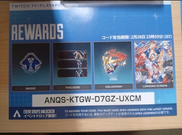 j'ai récemment obtenu un code de téléchargement twitch.tvPlayer qui devait me donner des cosmétiques (holospay, loading screen, trackers, badge).