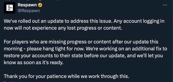 Nous sommes revenu dans le lobby avec une amie, un autre a rejoint l'escouade, on a tous persu la progression des derniers mois. Plus d'heirlooom pour aucun de nous, perte de niveau, de skins, badge et tout contenu gagné depuis un certain moment. Je suis passé du lvl 283 au lvl 194.
