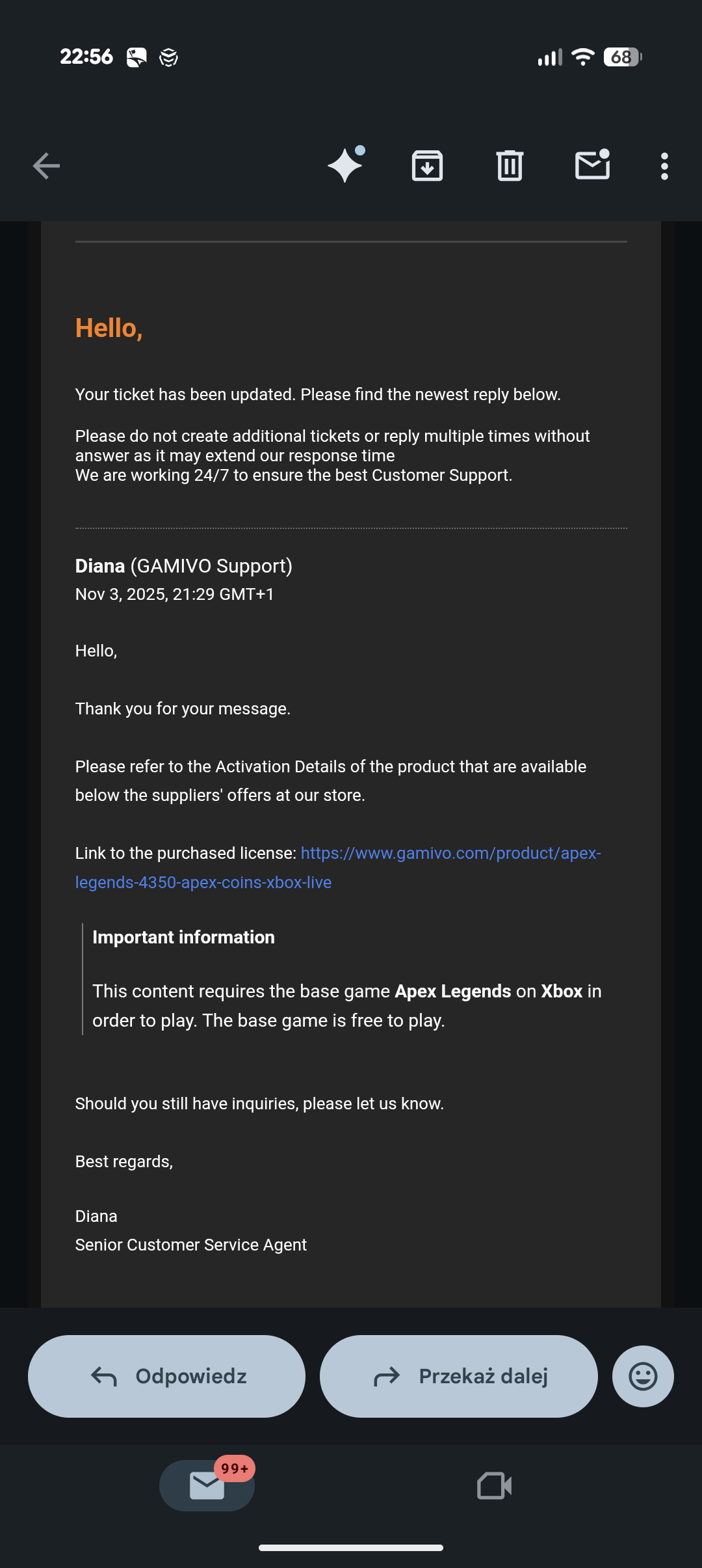 Wykorzystałem oficjalny klucz który był prawidłowy. Wykorzystałem go na Xboxie. Został zarejestrowany poprawnie. Sam support Xboxa to potwierdza, bo wysłał potwierdzenie. Mimo wszystko 4350 monet nie pojawiły się na koncie. Nie chcecie pomóc. Rozmawiałem z wami wiele razy. Sami macie taką informację na stronie aby rządać potwierdzenia zakupu i dopiero wtedy pisać. Gdy mam wszystko, zbywacie mnie. O co tutaj chodzi. Co mam zrobić aby otrzymać zakupioną walutę.
