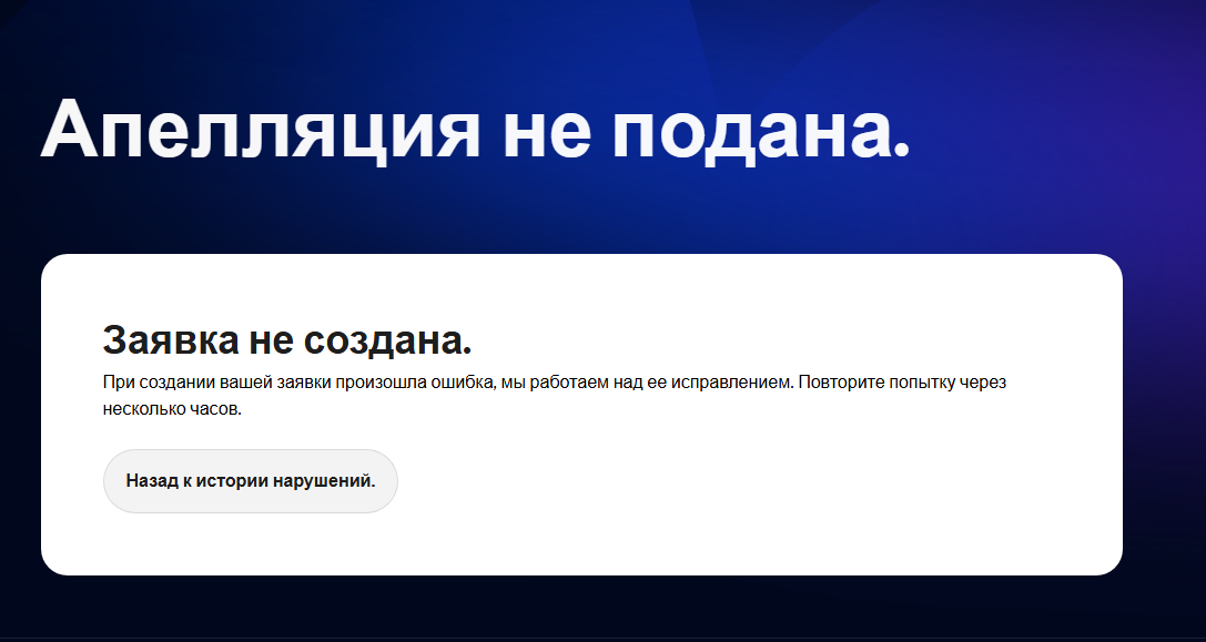 Весь день не получается отправить апелляцию, пишет - "Заявка не создана. При создании вашей заявки произошла ошибка, мы работаем над ее исправлением. Повторите попытку через несколько часов." Я прождала весь день, но отправить ее так и не получилось, как и найти как связаться с консультантом EA что предлагают после заполнения справки.