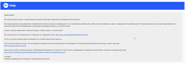 Всё началось с того что меня меня забранили без причины это весной, почему без причины? Ну просто на сайте, в истории блокировки, причины не было, мне пришлось в тех поддержку писать что бы узнать причину блокировки и то ответ дали только во втором письме, уличая меня в том что я манипулировал аккаунтами EA во время игры.