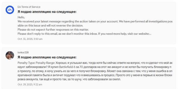 Блокировку конечно же не сняли, и её нет и на сайте. Конечно, я первым делом пошёл писать новую апелляцию, но не просто так этот пост называться "СПАСИБО EA ЗА ИГНОР", ведь теперь, я не могу написать новое обращение, ведь блокировки то в истории нет, и даже вручную заполняя все пункты в обращении, я всё его не могу отправить. Но как не могу, я его написал, отправил, но он не отправляется. В истории обращений ничего не появляется, за то при попытке снова написать обращение оно висит там как черновик.