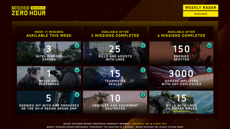 Le Radar hebdomadaire de Battlefield 2042 a pour but de suivre les missions hébdomadaires, les événements communautaires, les expériences vedettes et les récompenses que vous pouvez obtenir au cours d'une semaine particulière dans Battlefield 2042. Chaque semaine, nous ajouterons un nouveau fil de discussion dans notre section News et mises à jour, et vous verrez l'équipe communautaire le partager sur le Web afin que vous restiez au courant des choses que vous pouvez vous attendre à faire dans le jeu.