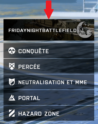 L'équipe travaille actuellement sur un correctif pour régler ce problème. Afin que le nombre de parties soient comptabilisées pour débloquer la plaque, le fond ainsi que que le pendentif d'arme, il faut attendre que l’événement FNB (Friday Night Battlefield) soit mis en valeur dans le menu du jeu comme ci-dessous.