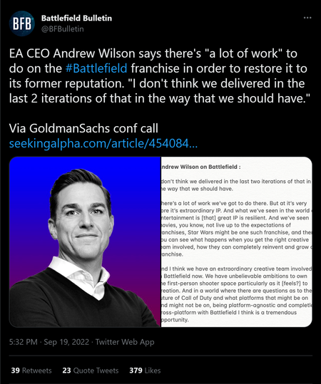 Looking back at the arc of this game, this all came down to profit margins. Dev time = less profits. So if you can get a title out the door as fast as possible with the shortest amount of dev time, you can cut the losses considerably. Then after it launches, you put most of that dev crew on another title and only leave the smallest amount of devs as humanly possible to maintain the title for the remainder of the lifecycle. That is exactly what we are seeing in BF2042. Hell, with the radio silence, I would not be surprised if the CMs were back clearing the Jira backlog.