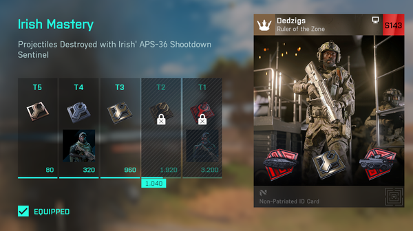 The skin requires the player to destroy 3,200 projectiles with Irish’s shootdown sentinel I’ve been specifically going for this skin for almost a total of 20 hours now and have only obtained 768/3,200 which is reticulum considering the other tier 1 skins I’ve acquired for Casper,rao,falck,paik,angel each only took like 8 hours max so Irish’s goal for the skin either needs to be lowered or changed altogether because the way objectives and maps are designed it’s nearly impossible to get a decent amount every game it just doesn’t happen even when you do what I’ve been doing which is try and bait explosives into vehicles I set up or when I gather near friendly tanks even then it’s not enough nobody uses that many missiles and grenades in this game they just don’t. Also dozer & Sundance may also be an issue I’ve yet to play either but those also seem ridiculous I see with most tier 1 skins all that was done was a 0 was added to the goal of the lower tier skin and in some specialists case this is way too much example being dozer goes from 80 shield kills to 800 and Sundance goes from 120 to 1,200 smart explosive kills which is just ridiculous and needs to be re-considered and for those wondering why I even care or who tell me they should focus on more important things you are right there are priorities this is just feedback coming from a completion it’s who likes to earn everything so just take that into account.