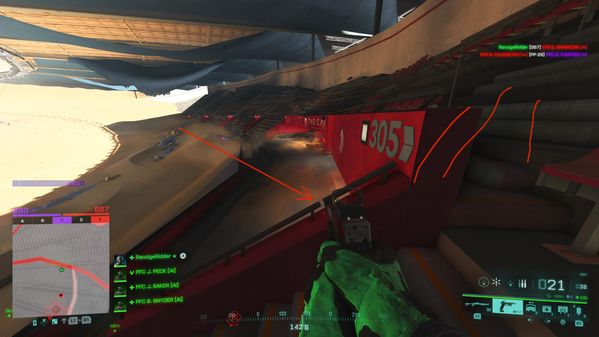 First picture is RU spawn area with the big open section from US POV. Look at minimap where the oob line is, I’m right at it next to that opening. I can easily drop in from the side, top or floor below by going a few secs oob. Usually you can kill some unsuspecting snipers and advance towards E where you will appear in the back of the defending RU side