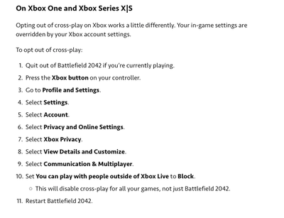 Product: Battlefield 2042 Platform: Xbox Series X Please specify your platform model.Microsoft Xbox Series X Are you using any software with an overlay?No Which part of the game is the issue happening in?Game Menu In which game menu were you when the bug occurred?General / Options - Other section Please select your regionEurope On which server did this happen?Live environment When did this happen? (dd.mm.yy hh:mm)11.11.21 16:29 CET Summarize your bugGo into your Soldier's "General / Options - Other" section, where you can select to opt in or out of CrossPlay by choosing OFF or ON. Here it appears as being ON by default. But when going to the toggle switch, the option is actually disabled to be toggled as you want. So it is not possible to choose to select OFF for CrossPlay. It is forced ON permanently. How often does the bug occur?Every time (100%) Steps: How can we find the bug ourselves?Follow the steps as described above, on how to get to that plave in the menu where you change your preference for CrossPlay ON/OFF: Go into your Soldier's "General / Options - Other" section, where you can select to opt in or out of CrossPlay by choosing OFF or ON. Here it appears as being ON by default. But when going to the toggle switch, the option is actually disabled to be toggled as you want. So it is not possible to choose to select OFF for CrossPlay. It is forced ON permanently. What happens when the bug occurs?You do not have the option to put CrossPlay to OFF as we wanted it to be. We are forced to be in CrossPlay by default, no matter if we want to or not. What should be happening instead?We should have the toogle switch working instead, so we can set our preference to CrossPlay = OFF.