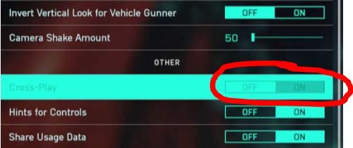 Screenshot of the disabled CrossPlay toggle switch in your Soldier's "General / Options - Other" section:
