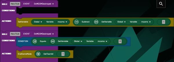 For example, if you make a game where both teams fight over 1 MCOM, you’d need to include some logic that says something like “if team 1 destroys the MCOM, then declare team 1 the winner” and vice versa.