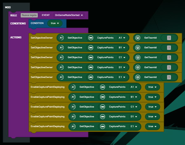 Nella seguente programmazione ho utilizzato questo blocco per abilitare lo schieramento all'interno di tutti i punti di cattura della mappa.