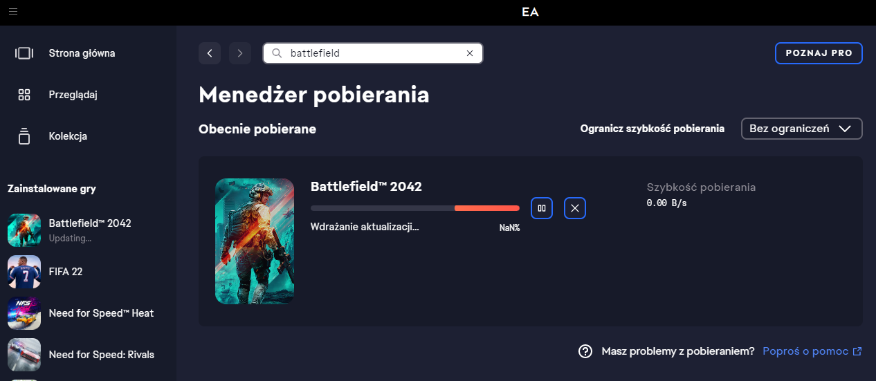 Od kilku godzin próbuje bezskutecznie zainstalować aktualizacje do gry Battlefield 2042. Aktualizacja pobiera się cała, do momentu kiedy pojawia się proces wdrażania aktualizacji - pasek ładuje się w nieskończoność i pokazuje NaN%. Restart komputera, reinstall aplikacji, wyczyszczenie pamięci podręcznej - wszystko zrobione. Już nie mam pomysłów.
