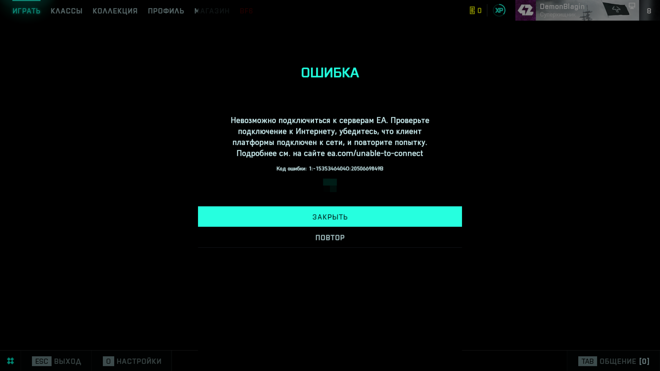Купил игру и не могу зайти не на один сервер.Если заходить на сервер через "Portal" то выдает ошибку что "невозможно подключиться к серверам EA".Если заходить на сервер через быструю игру то выдает ошибку "Вы исключены,все игроки вышли" либо "Игра закончилась",пробовал менять ip и DNS подключение,пробовал обход блокировок серверов Amazon.Ничего не помогает,кто играет-подскажите как починили это и что вообще делать?возвращать деньги за игру?