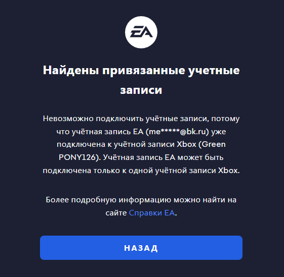 Здраствуйте. Решила привязать свой XBOX аккаунт к аккаунту EA для синхронизации данных, но у меня вылезла ошибка. В самих настройках привязка доступна, никакой аккаунт не привязан и не был привязан ранее (скриншот 1), но EA видимо считает иначе и показывает фантомную привязку аккаунта (скриншот 2). Как это фиксить?