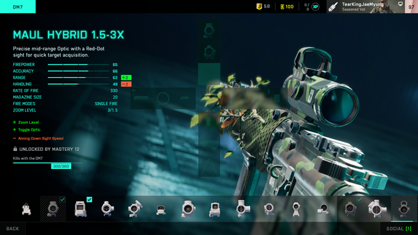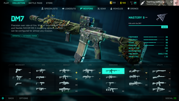 Summarize your bug DM7's mastery level is stuck at 9. And the DM7's kill count is also stuck, so I can't unlock new attachments.