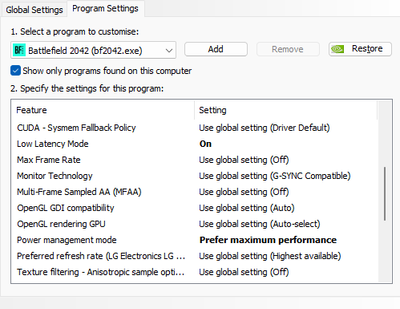 In the same screen after selecting BF2042 scroll down the features and find "Power management mode" and set it to "Prefer maximum performance"