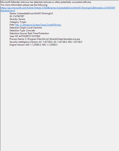 The report that h3x1e sends is to notify the anti-cheat team that “eaanticheatgameservice.exe” generates a temp file that is considered a “Winring0” by Defender. But he can still continue playing the game. Like me, for example.