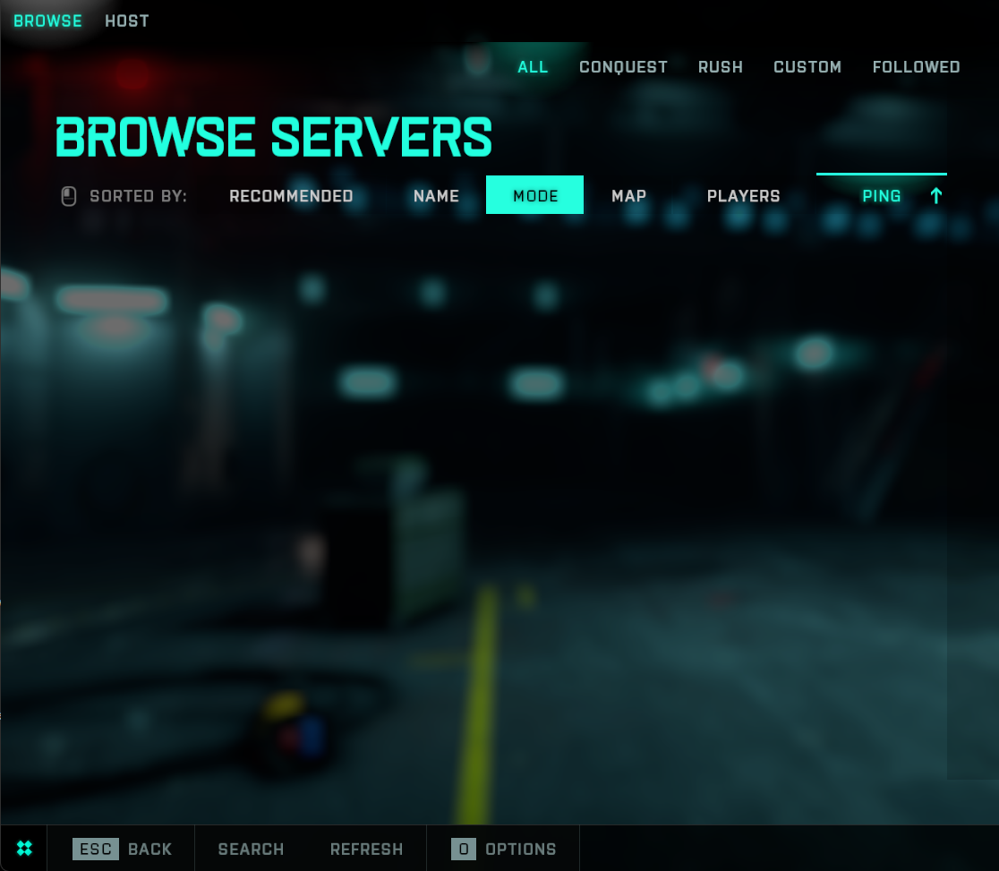 To my horror, there's absolutely no servers showing on the list ! I clicked on each tab that's at the top of the screen, meaning "ALL" "CONQUEST" "RUSH" "CUSTOM" AND "FOLLOWED" and no servers are showing in any of these tabs.