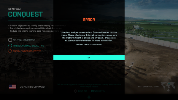 It seems EA is mostly down. Multiple games affected. Downdetector has a surge or reports. BTF V has the black-screen on join. About full year ago they, EA, had exactly the same problem. Everything down complete weekend, you know weekend, when people have the time to play a game...