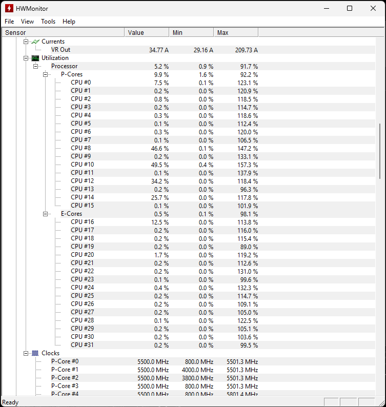 Adjunto captures de HWMonitor considerando que el juego era el único programa abierto y puede notarse la diferencia entre el sistema con carga (MAX), y el juego cerrado (Value).