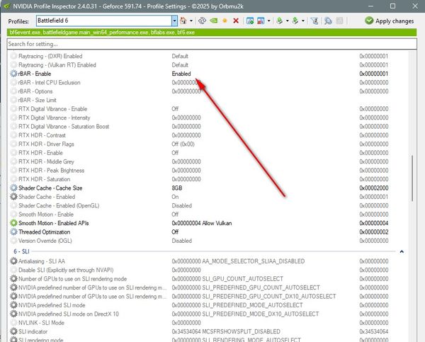 Si on regarde le profil nVIDIA du jeu BF6 , dans l'application Nvidia Profile Inspector, la fonction rBAR est désactivée (valeur 0x00000000)