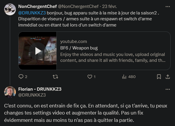 Est ce que quelqu’un peu faire remonter le truc sur les bug d'affichage des armes ? par moment, pour pas dire régulièrement, quand je respawn mon arme est invisible ... c'est galère (j'ai un ordinateur récent, avec ce qu'il faut en configuration, alors c'est pas la le souci).