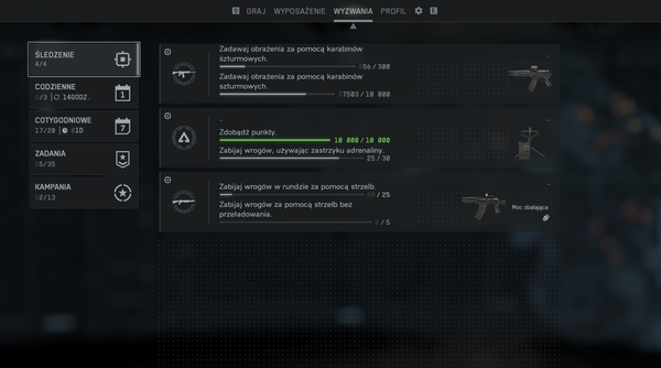 1 z 4 slotów na śledzenie wyzwań jest według gry zajęty, ale wyświetlają mi się tylko 3 śledzone wyzwania. Jeżeli wszystkie przestanę śledzić to nadal mam 1/4 slotów zajęte. Prawdopodobnie jest to jedno z wyzwań z pierwszego tygodnia, które zostało usunięte / ukryte? Dla tygodnia pierwszego teraz widzę 10, a dla drugiego 11 wyzwań.