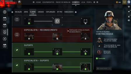 Estou na mesma situacao. Desafio 1 diz que esta concluido mas nao liberou nenhuma arma nem dispositivo. Tentei reiniciar o jogo, ou entrar numa partida, mas nada funcionou.