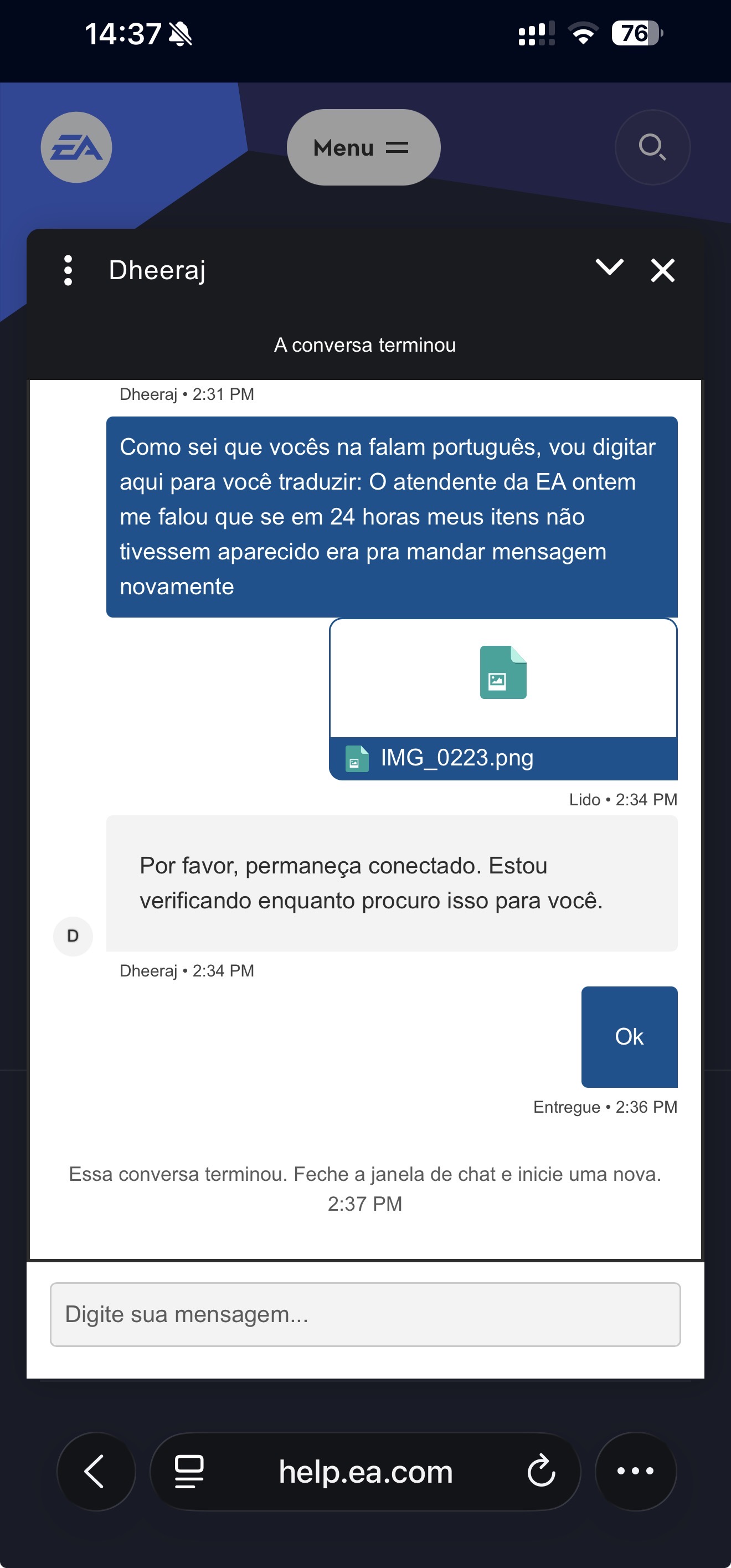 Por fim, ainda estou sem os itens, os indianos que atendem no EA Help, não ajudam em simplesmente nada… e até agora nenhum posicionamento da EA sobre isso… já estou até cansado de tanto mandar mensagem, escrever e tirar fotos e prints e nada ser resolvido.