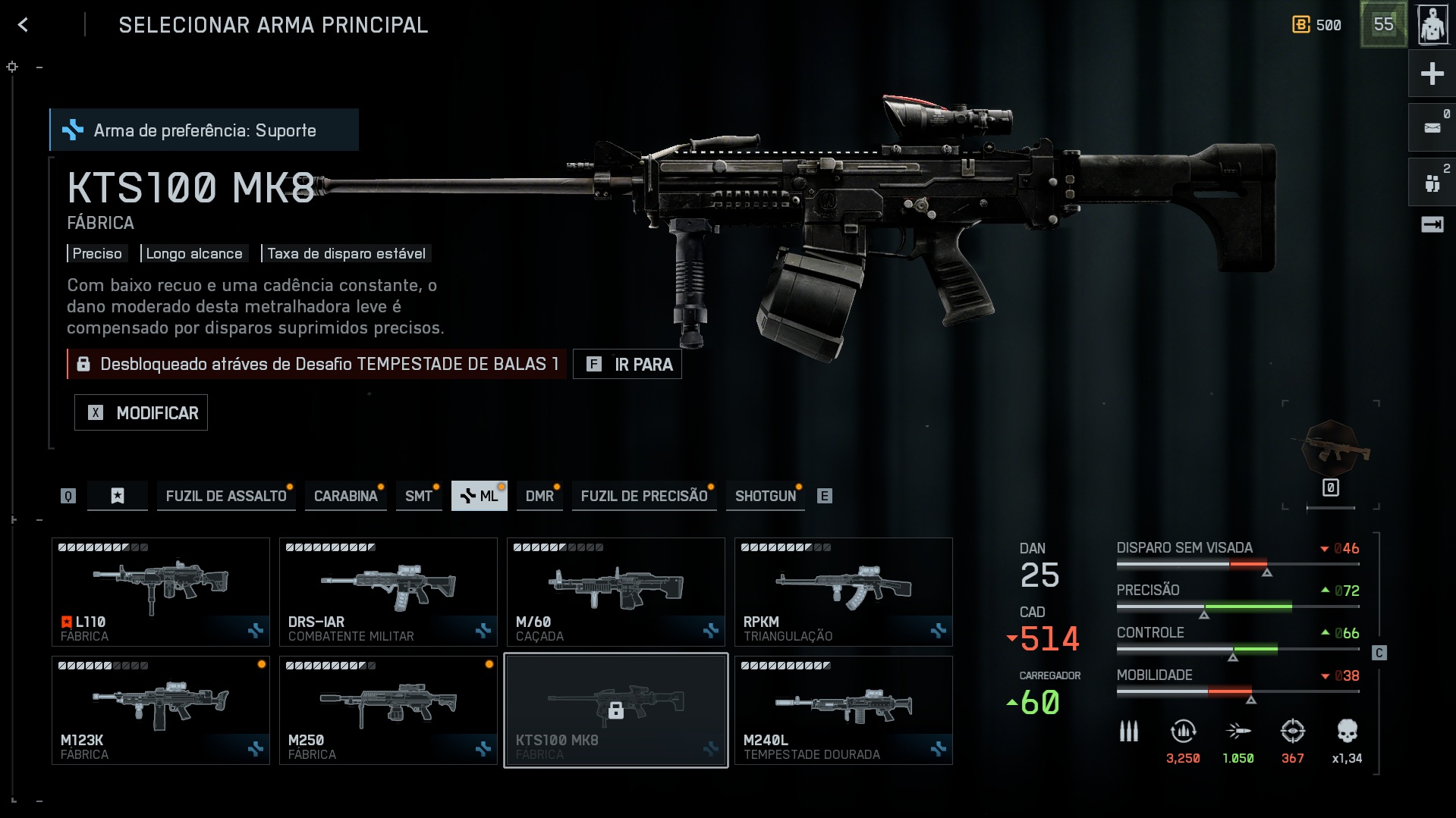 Estou jogando BF6 já há alguns dias e estou tentando fazer os desafios para desbloqueio de novas armas e novos itens. Uma das armas é a KTS100 MK8, fiz o desafio que a desbloquearia, porém ela ainda está bloqueada no meu painel de armas conforme os prints de tela a seguir.