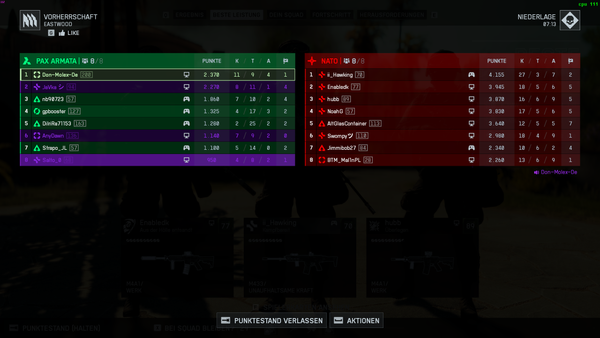 heute wider 4 Runden no win ! ein Spieler killt in nicht mal 10 min 150/5 Gegner Platz 2 nicht mal 50! mein Team bester 58/16 so was schaff ich nicht mal wenn ich mit einen Tank bemannet in die Maße Baller.